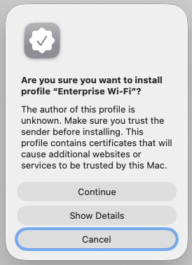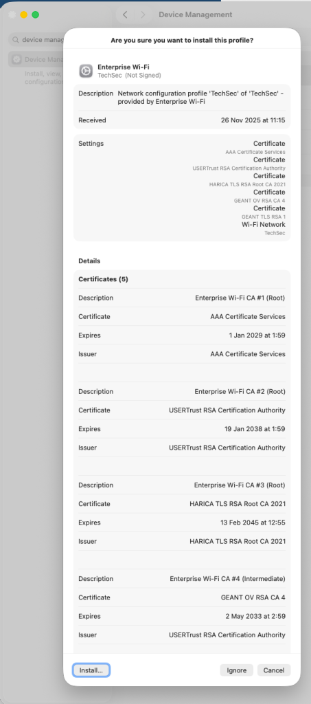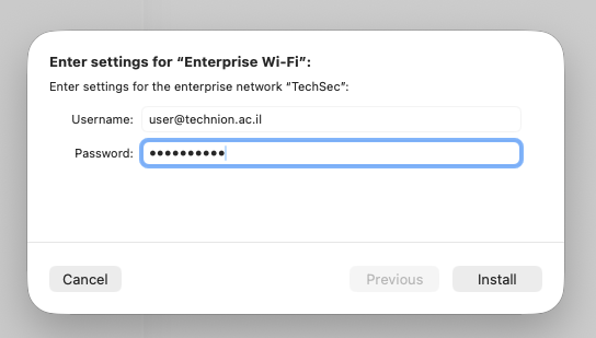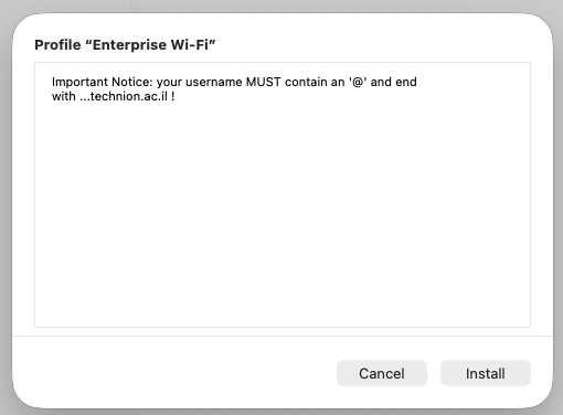 - לחץ פעמיים על Enterprise Wi-Fi, ודא שהוא נראה כמו בתמונה למטה ולאחר מכן לחץ על כפתור Install…: