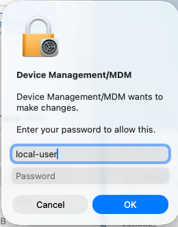 - הזן את סיסמת המשתמש המקומית שלך ולחץ על כפתור OK: